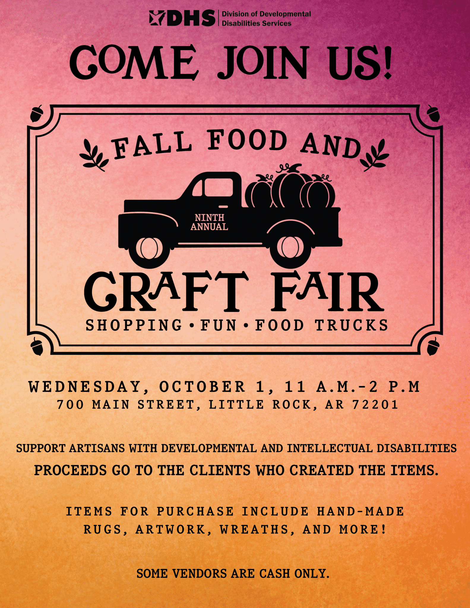 Nearly 20 vendors and six food trucks will line the streets in downtown Little Rock this Wednesday at 7th and Main for the 9th Annual Fall Food & Craft Fair. The event is sponsored by the Arkansas Department of Human Services (DHS) and will run from 11:00 am to 2:00 pm.